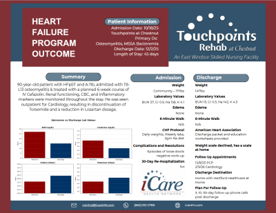 At iCare Health Network, strong outcomes begin with strong systems of care. A recent Heart Failure Program success at Touchpoints at Chestnut reflects how consistent oversight and coordinated planning make a meaningful difference for medically complex residents. A 90-year-old resident with heart failure and atrial fibrillation was admitted for IV antibiotic treatment related to osteomyelitis, requiring a 45-day stay . Throughout his time at Touchpoints at Chestnut, he was supported under our str… -